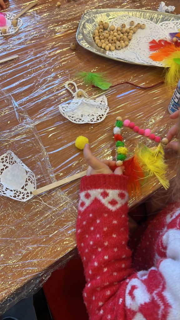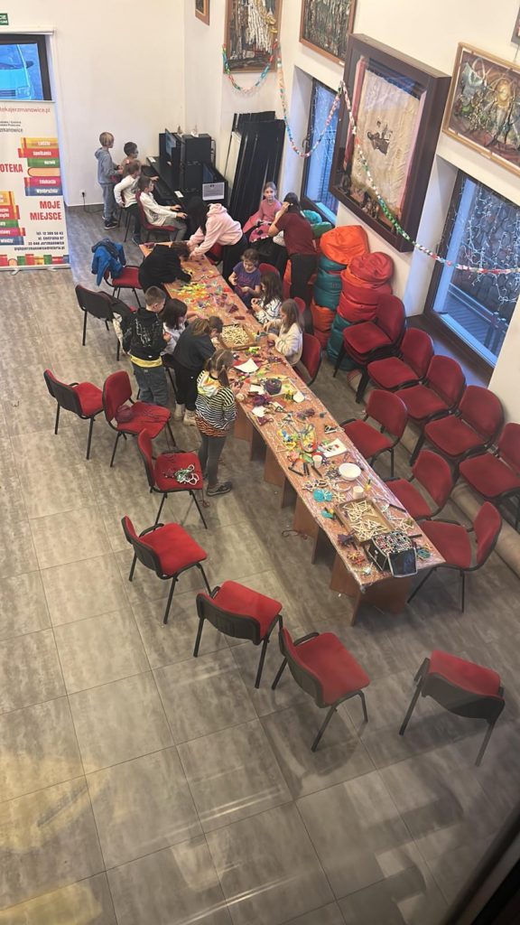 Na ostatnie zajęcia przewidziane było coś wyjątkowego. Dzieciaki znów mogły porobić ozdoby dowolną techniką. Potem szybkie sprzątnie i mycie rąk, bo przyszedł czas na ozdabianie pierniczków. Uczestnicy stanęli przed bardzo trudną decyzją dotyczącą swoich ciasteczek – zjeść czy powiesić na choinkę swoje pyszności.