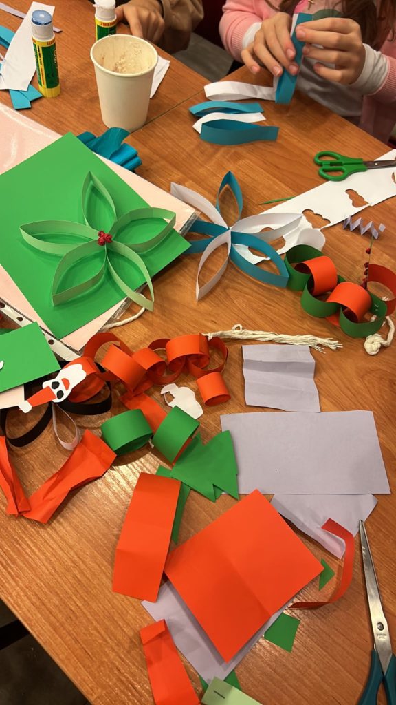 Pierwsza środa (3.12) należała do papieru. Najpierw uczestnicy podzielili się na grupy i rywalizowali między sobą, kto zrobi dłuższy łańcuch choinkowych, a potem w pracach indywidualnych tworzyli papierowe aniołki, gwiazdki oraz inne cuda, które podpowiadała im wyobraźnia. Ich trud został nagrodzony smaczną gorącą czekoladą z bitą śmietaną.